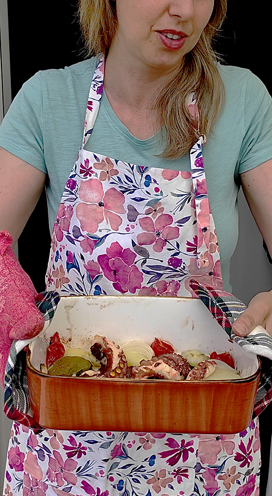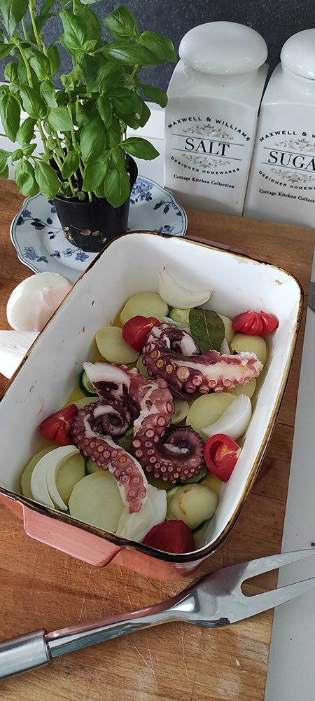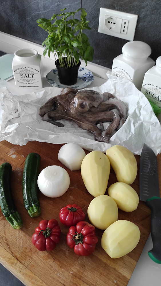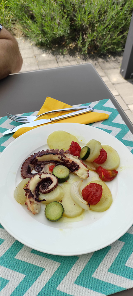 Qui sotto il piatto tipico del posto: polpo al forno con patate e verdure.