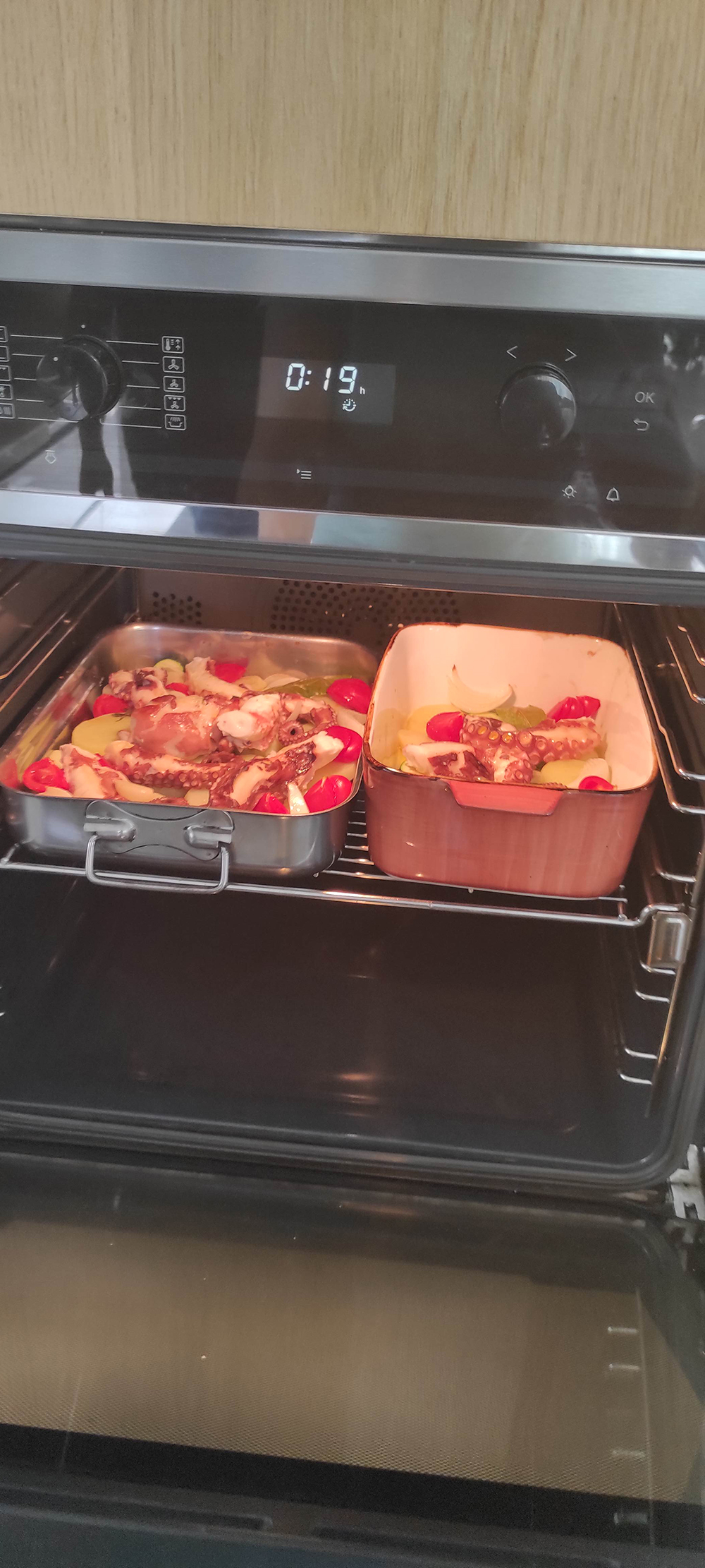 Ora sfiatate la pentola a pressione e tagliate i singoli tentacoli. Poneteli sulle verdure. Irrorate d’olio per evitare che si secchi. Portate verdure e polipo di nuovo il forno a 200° e cuocete per ulteriori 20/30′. Il piatto è pronto quando le patate sono pronte.